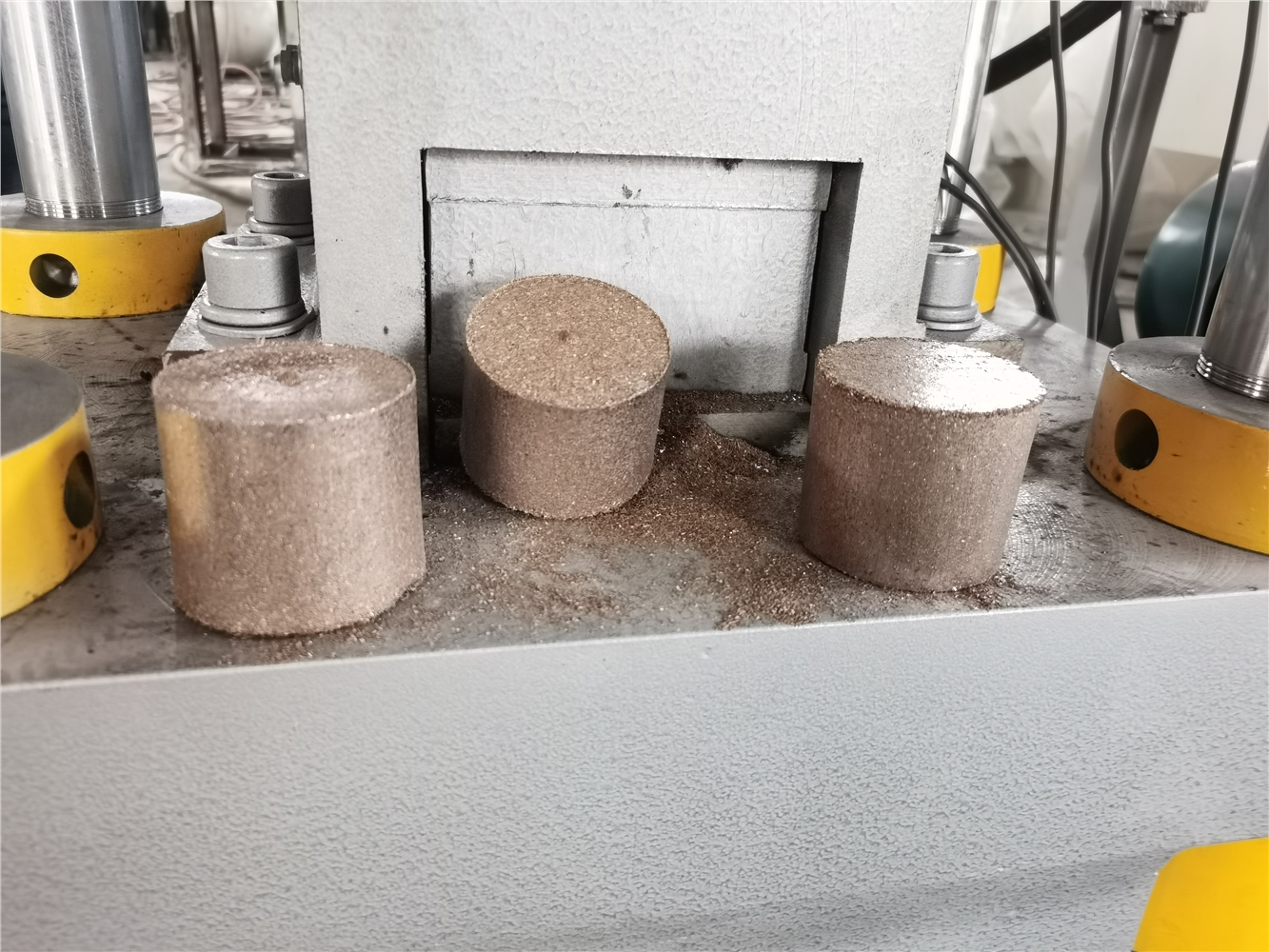 銅屑?jí)簤K機(jī)主要包括主油缸,快速缸,推板缸,螺旋加料,模具部分,泵站部分,電氣箱部分等。